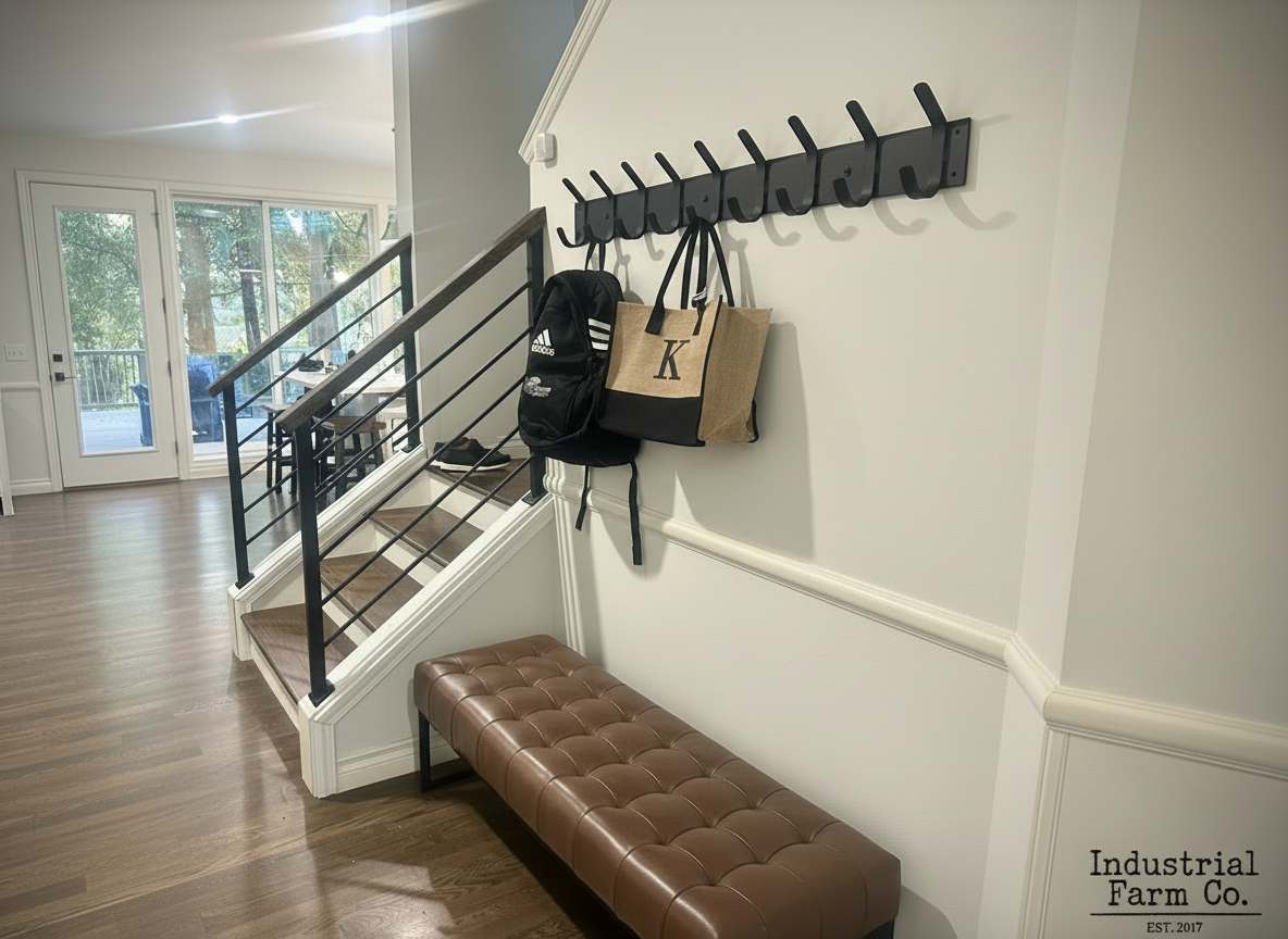 Introducing The Industrial Farm Co Riseform Heavy-Duty Steel Coat Rack - a stylish and functional accessory for any home or office. Crafted with meticulous attention to detail, this coat rack features a 4-inch wide backplate and 1-inch wide hooks that are expertly welded to provide reliable support for your coats, hats, and other accessories.