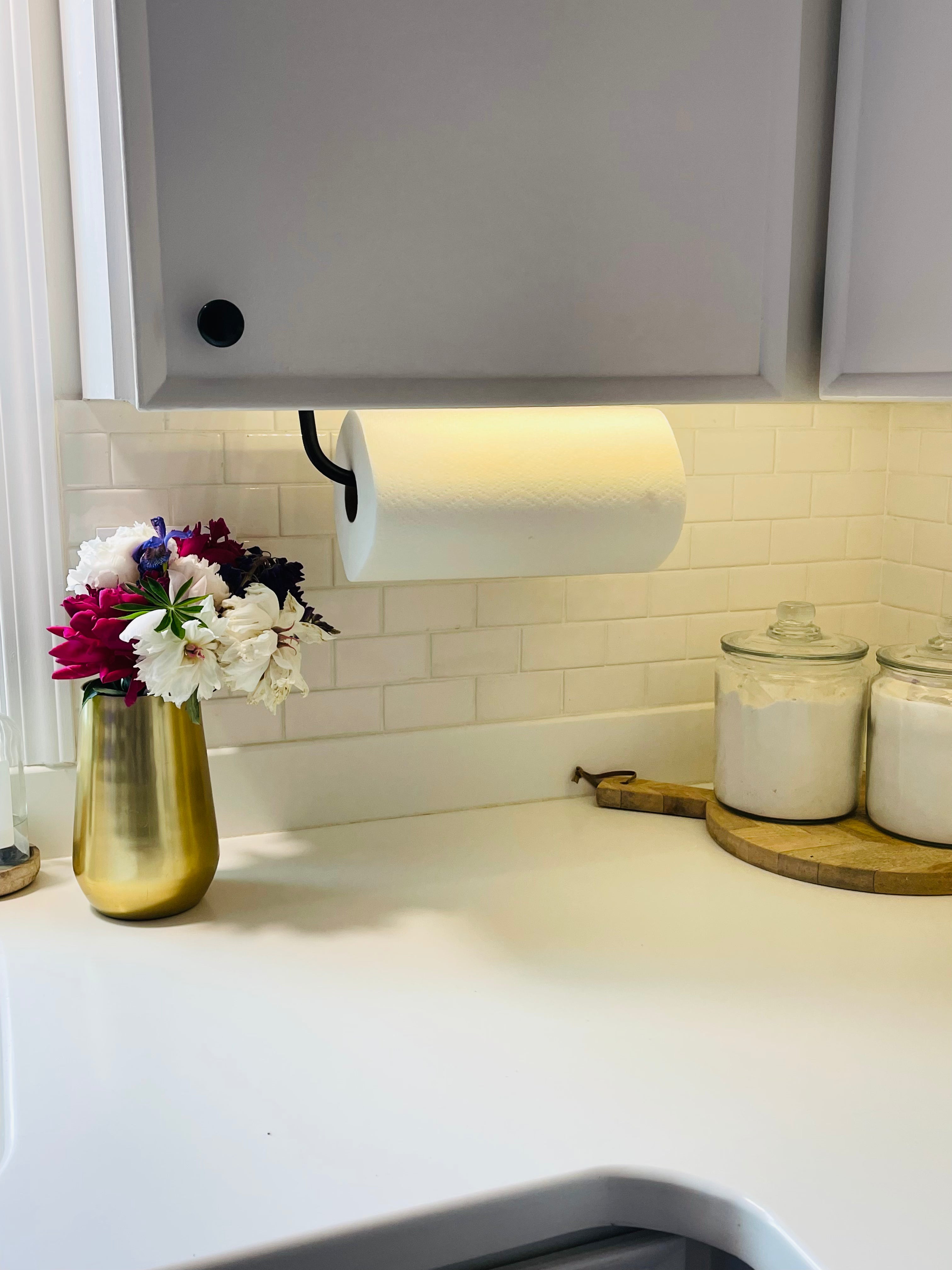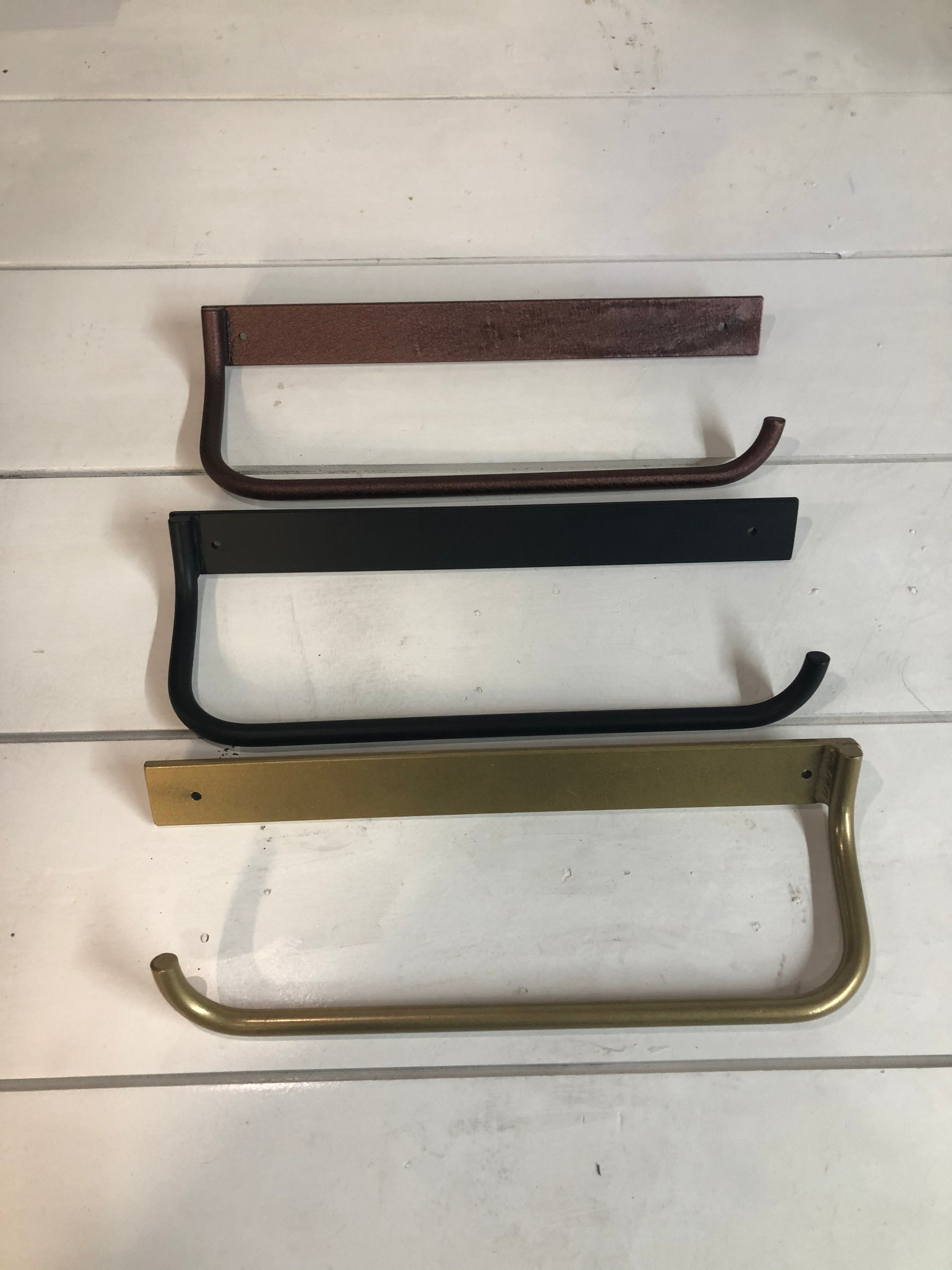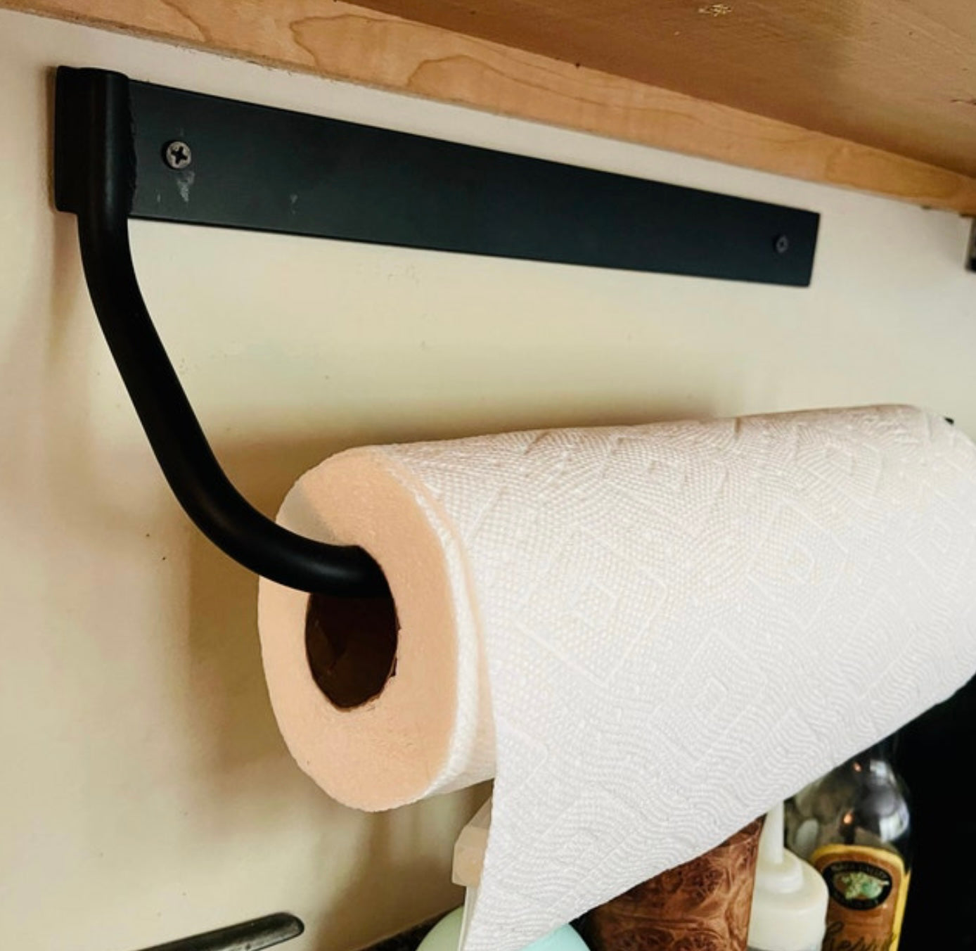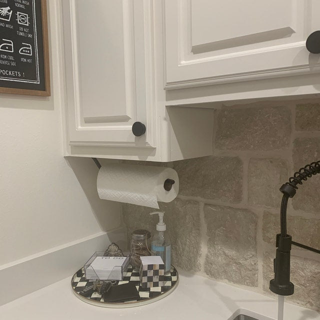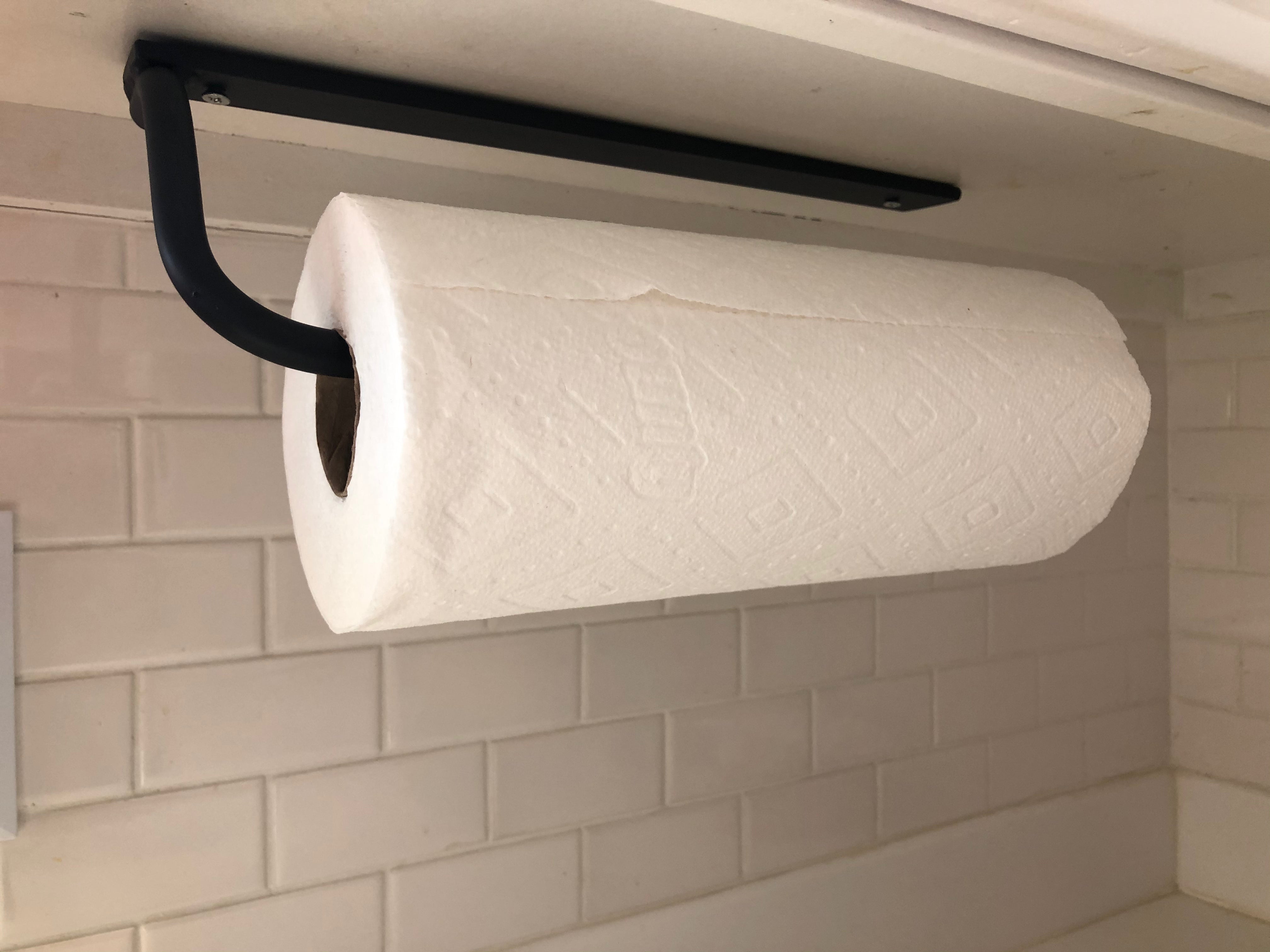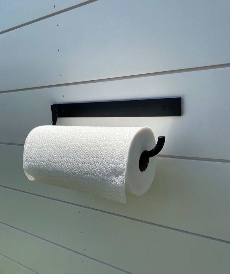 The Hyde Hall — an industrial paper towel holder with serious presence. A ½" solid round bar is welded onto a sturdy flat bar plate for a classic farmhouse look. This paper towel holder is a simple upgrade for any home kitchen design, and it comes in a variety of finishes. Whether you're going for an industrial, minimalist, farmhouse, or simply a more organized look, the Hyde Hall is the perfect solution. Made to order in Central NY by a family shop with 53,000+ sales and 8,000+ five-star reviews.