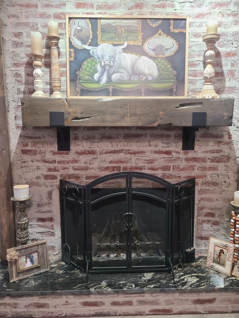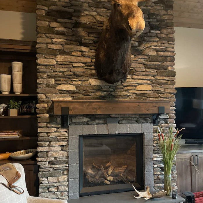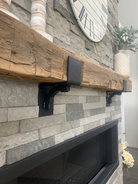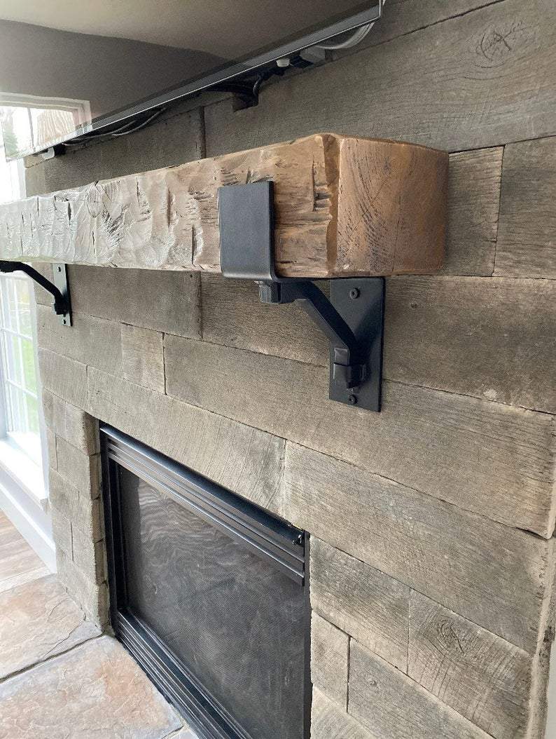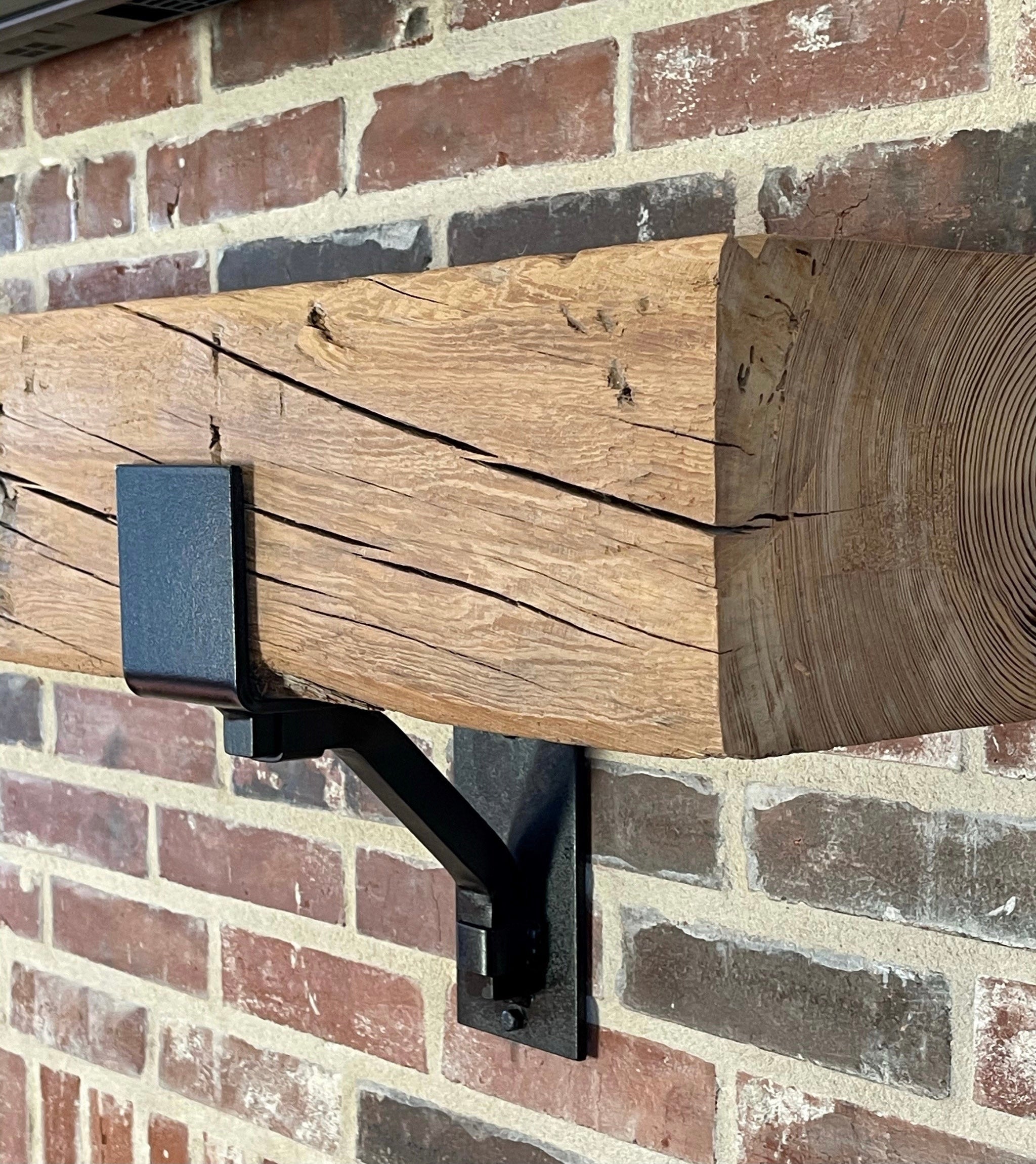 We make several mantel bracket designs: → The Buffalo – square support bar with metal straps (this listing) → The Kudlick – curved support bar, classic farmhouse → The Spafford – 3" with decorative rivets → The Clermont – 4" with decorative rivets → The Mottville – 5" with decorative rivets