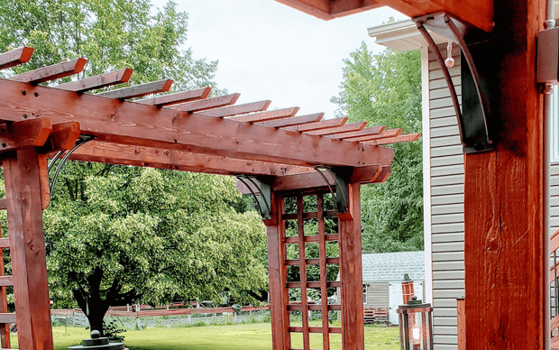 Modern kitchen with marble countertop, wooden shelves, and large windows.