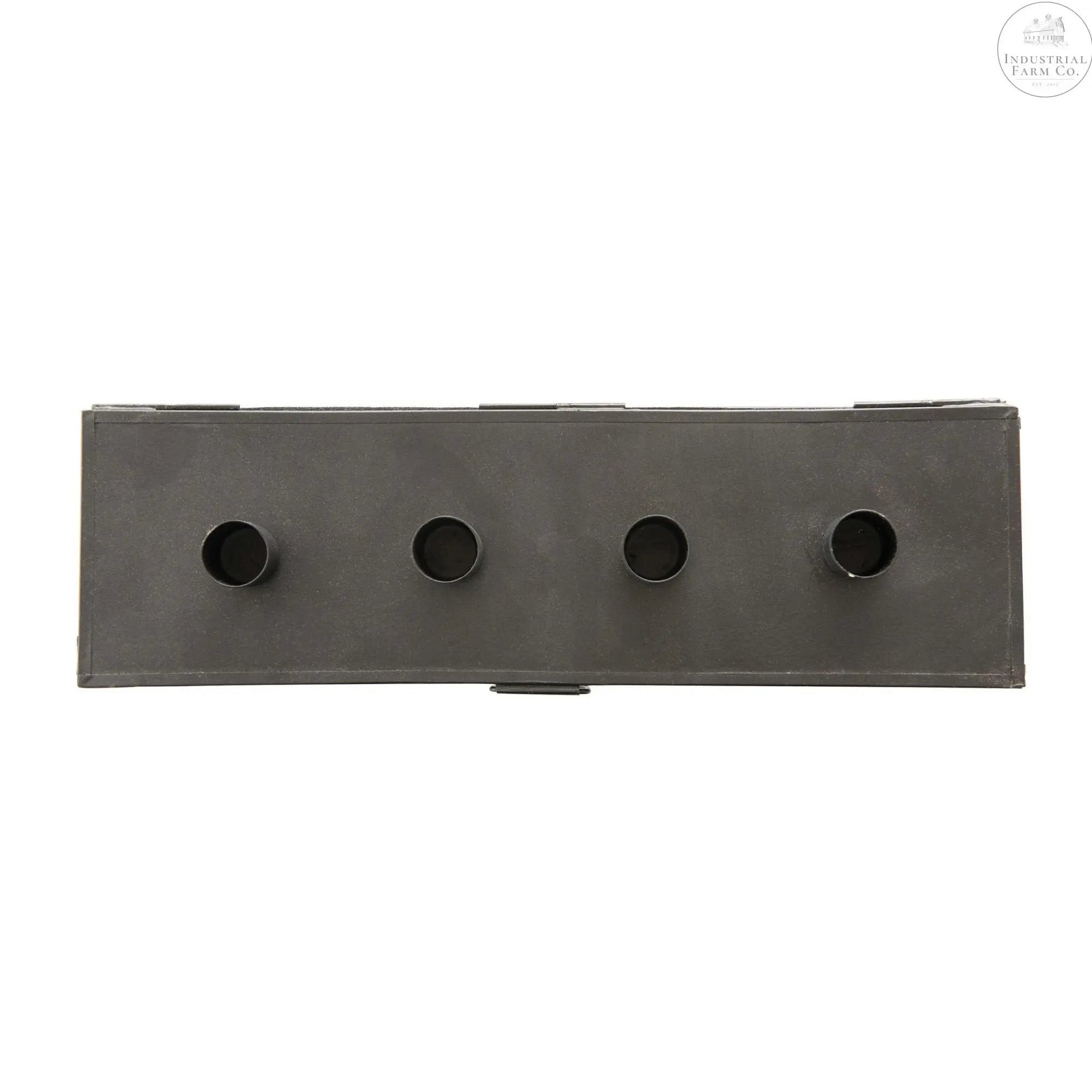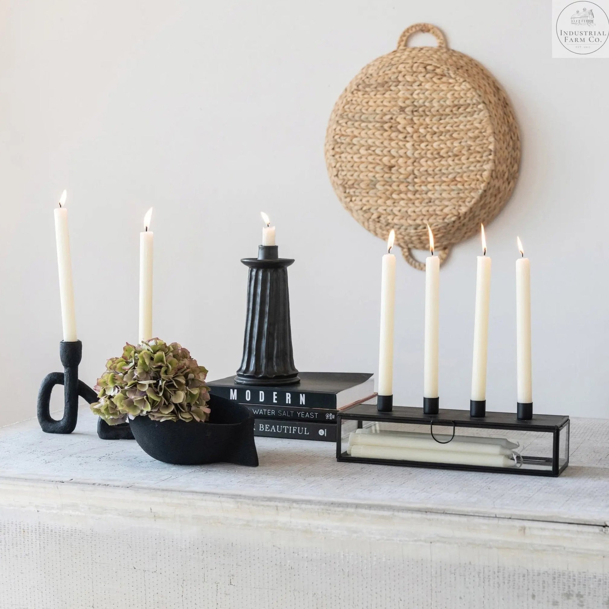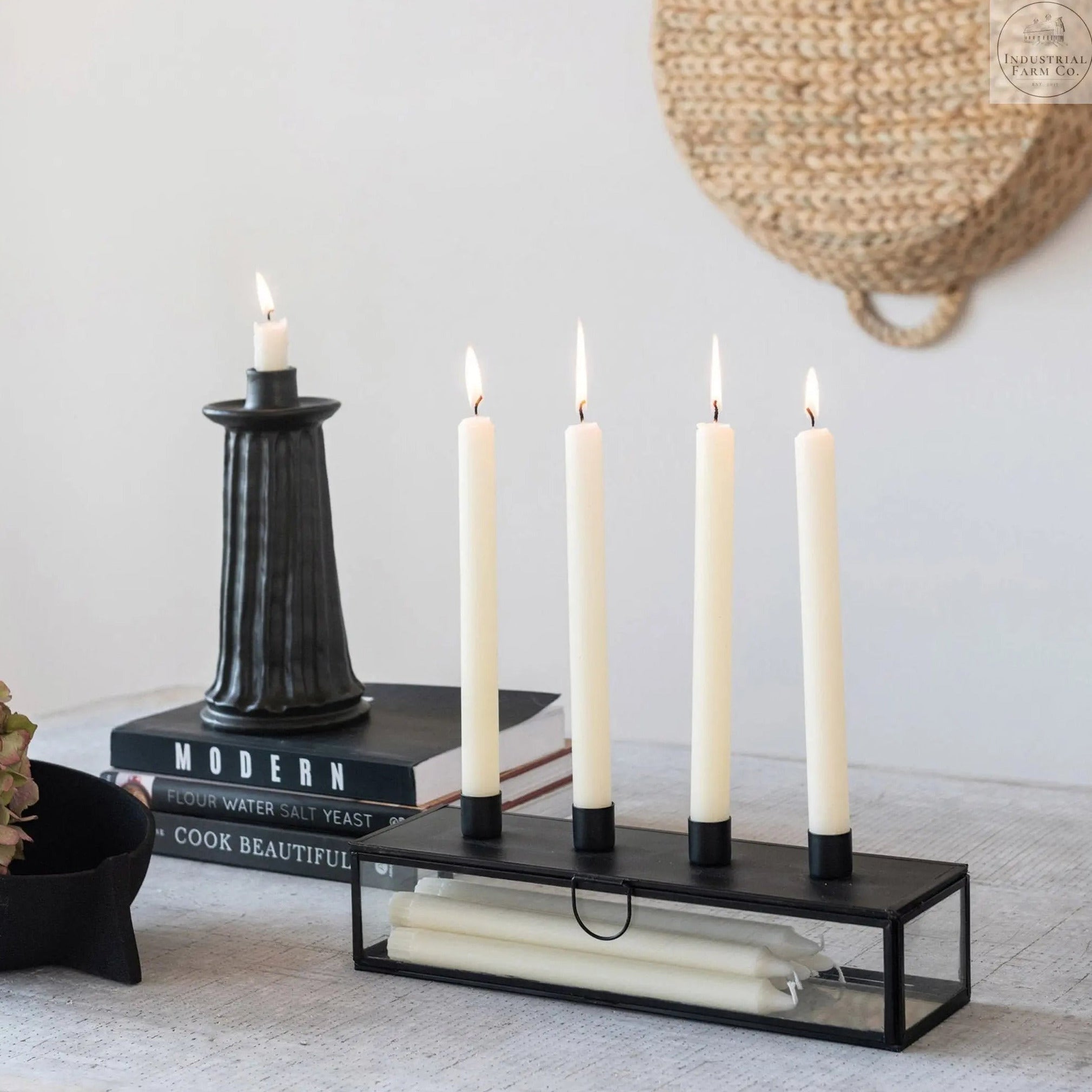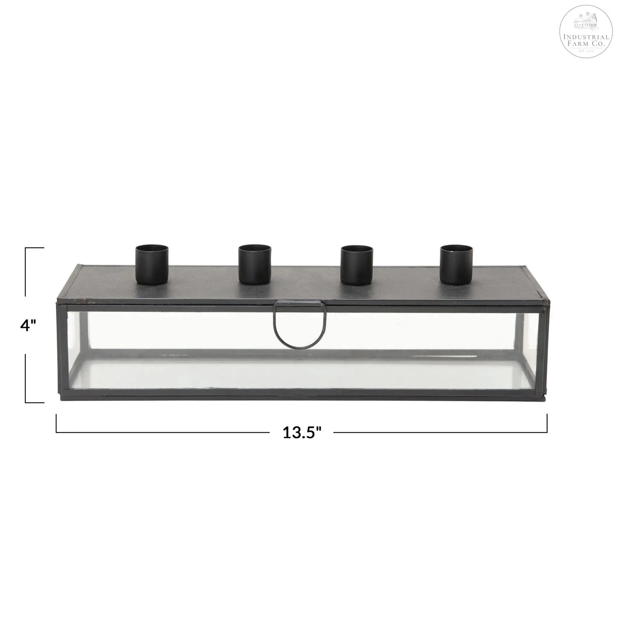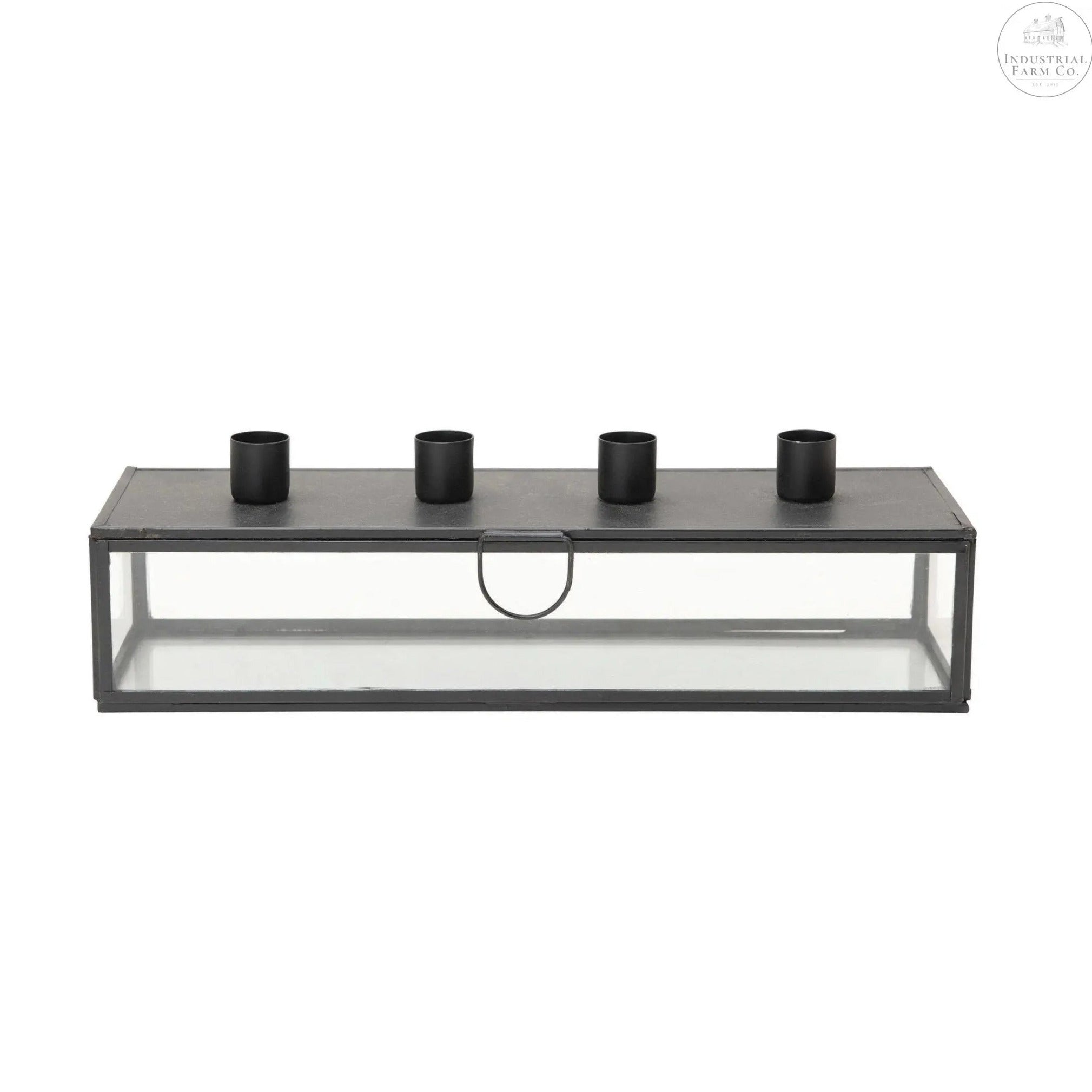 This intriguing and engaging metal and glass display case with a taper holder lid has a matte black finish and holds four taper candles. Stately and sleek, this display case will be a prized piece of decor in any bedroom, living room, den, or office.