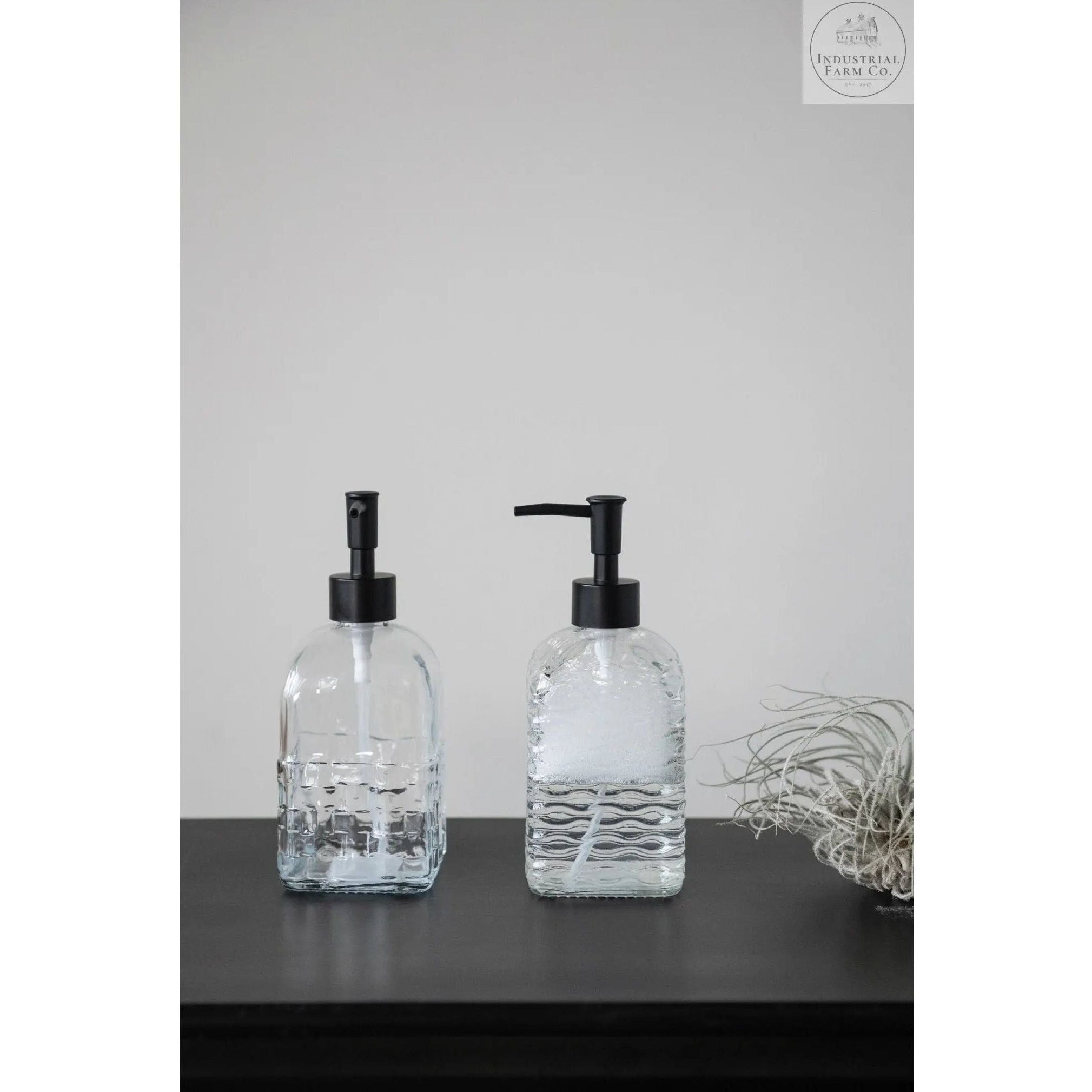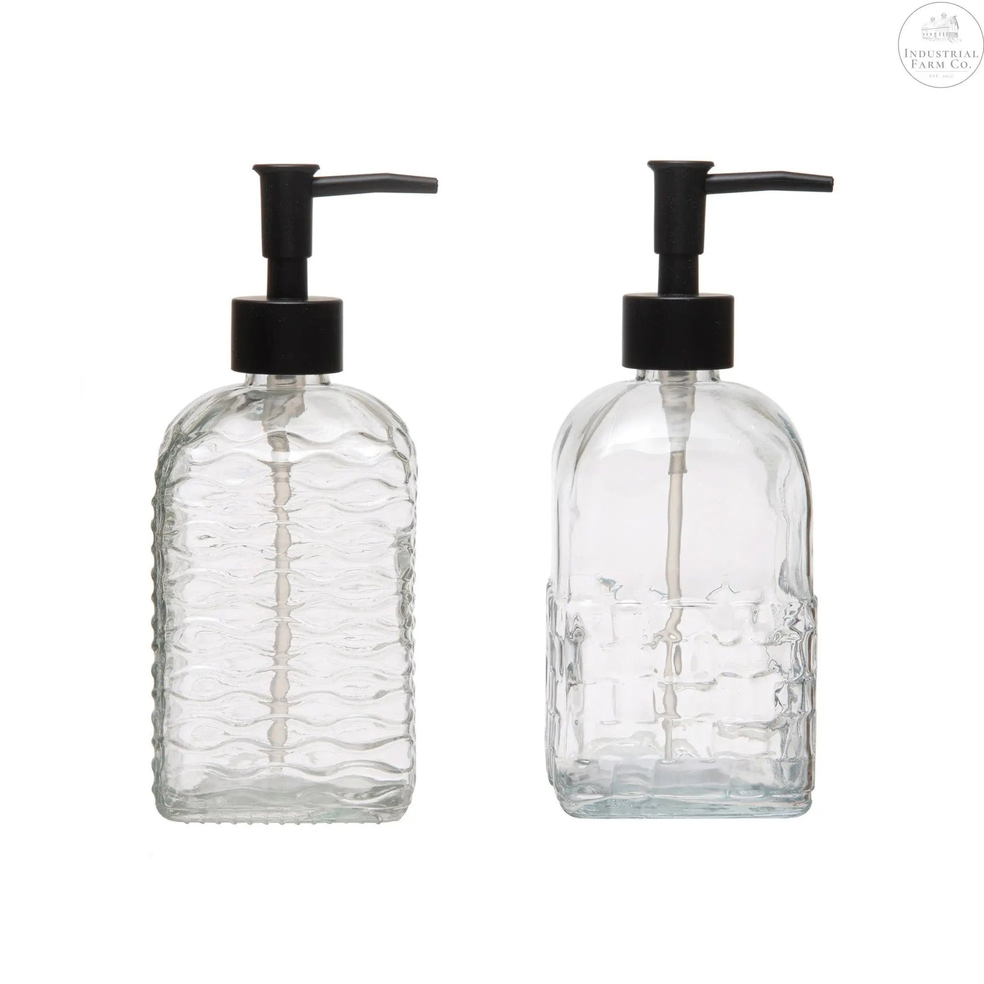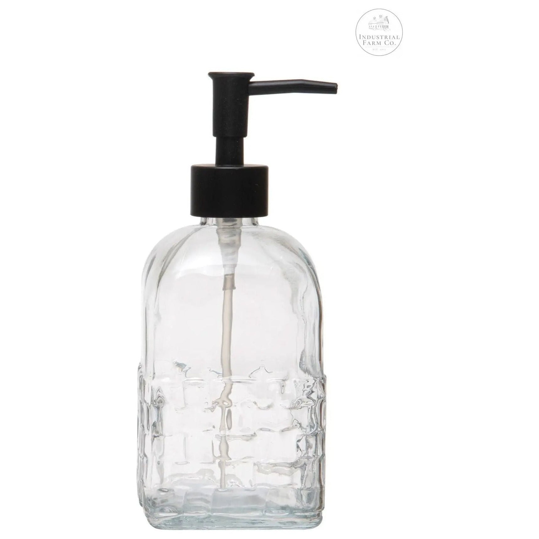 - Embossed Glass Soap Dispenser with Plastic Pump