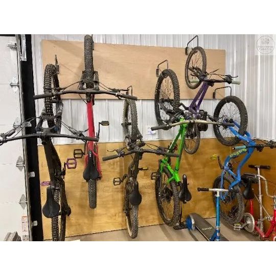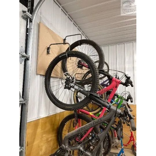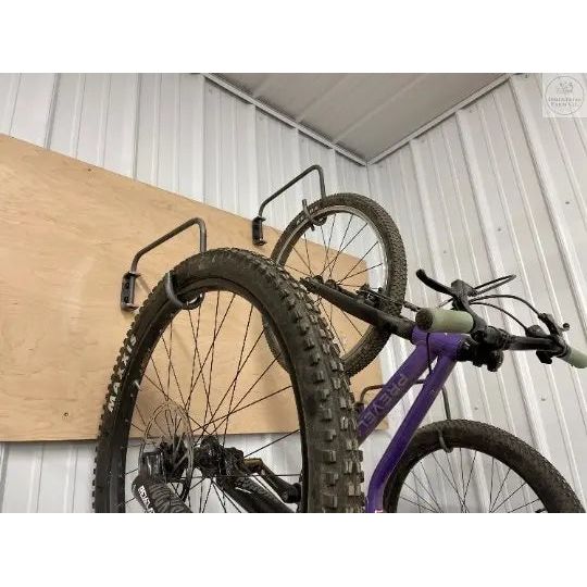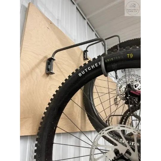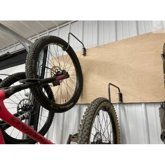 Hang your bikes with ease! These handmade individual bike hooks are able to be installed at different heights. Organize your bikes and free up floor space in your garage/barn. These are made from 1/2" solid bar that is mounted to a C bracket. Bar swivels to allow you to store the hook flush to the wall when they aren't in use.