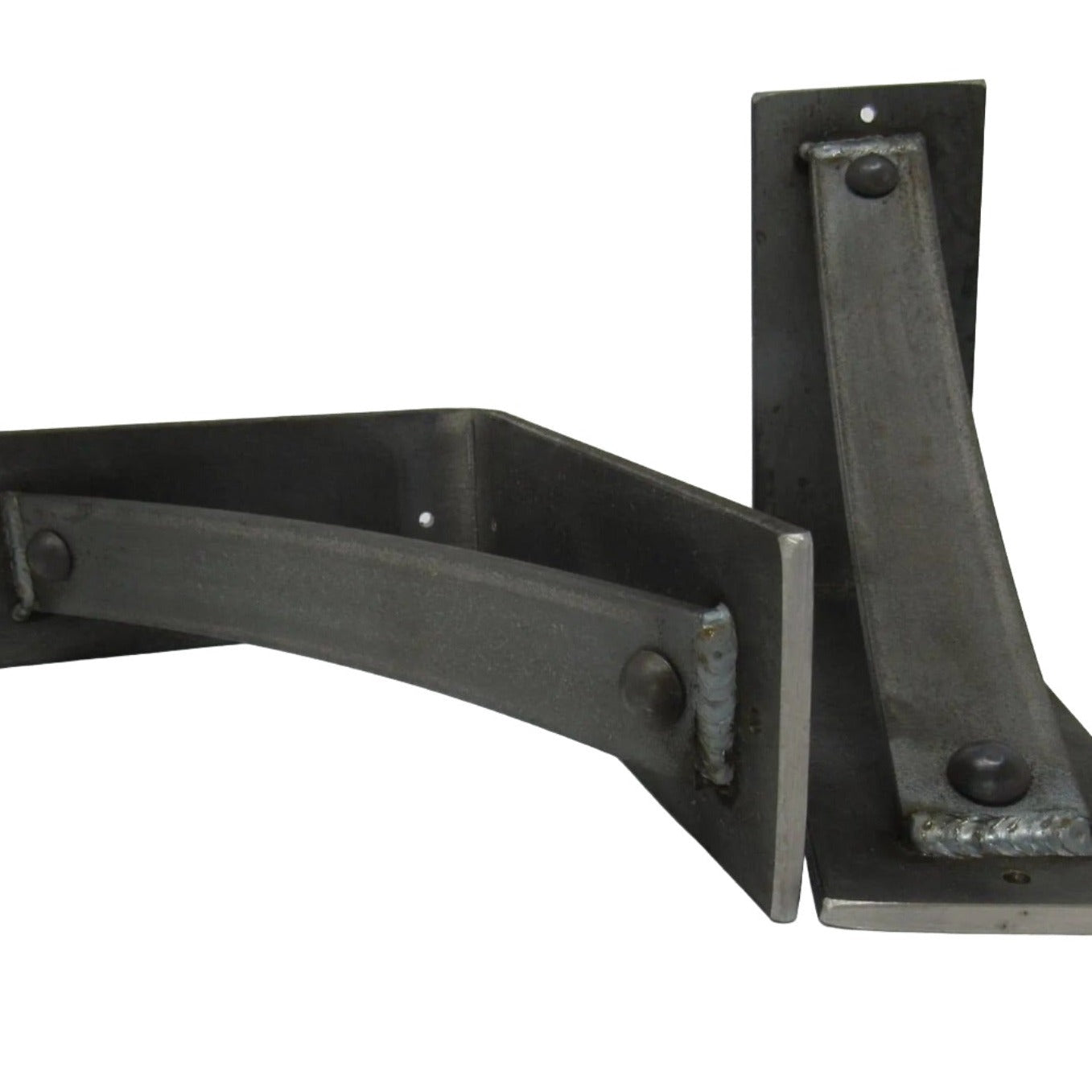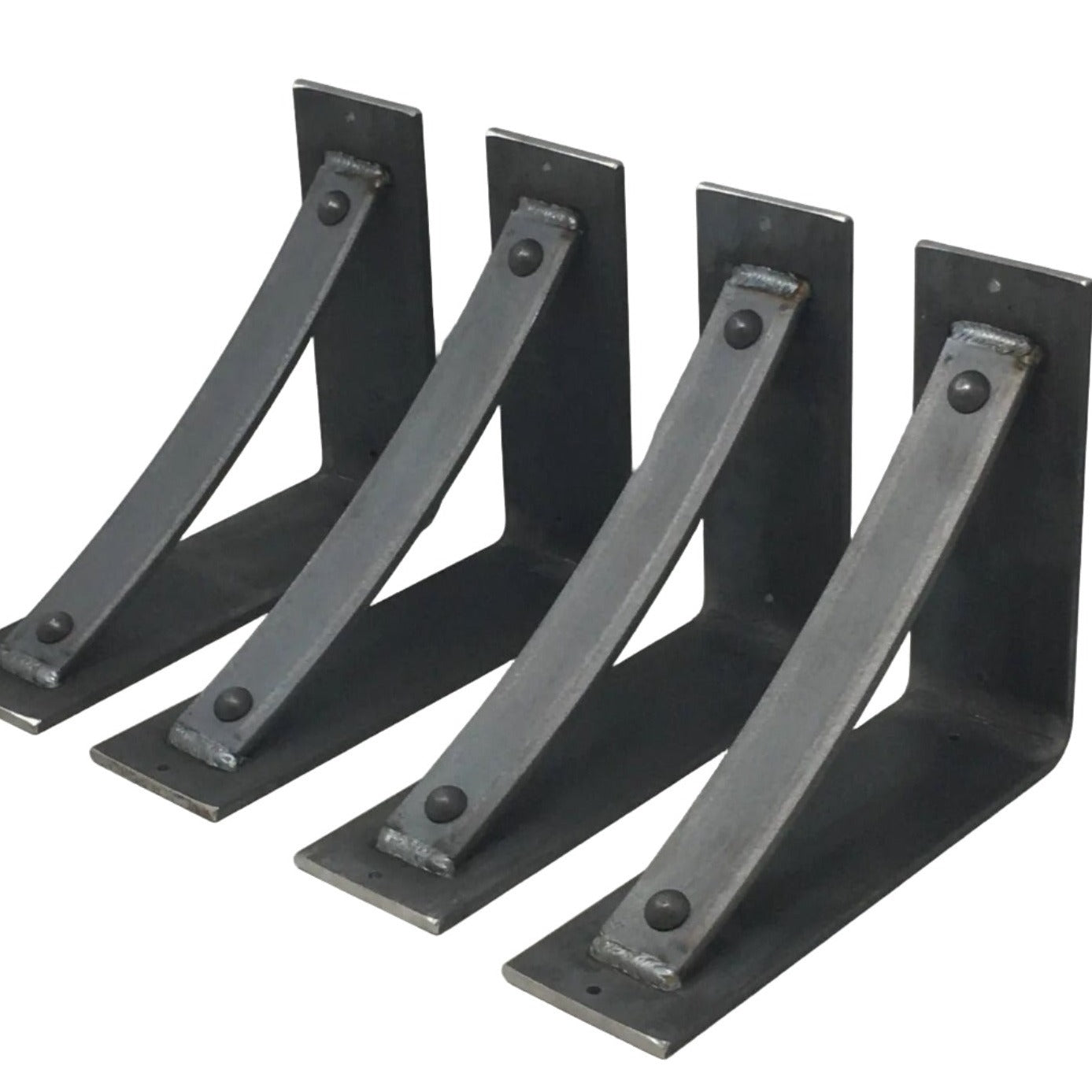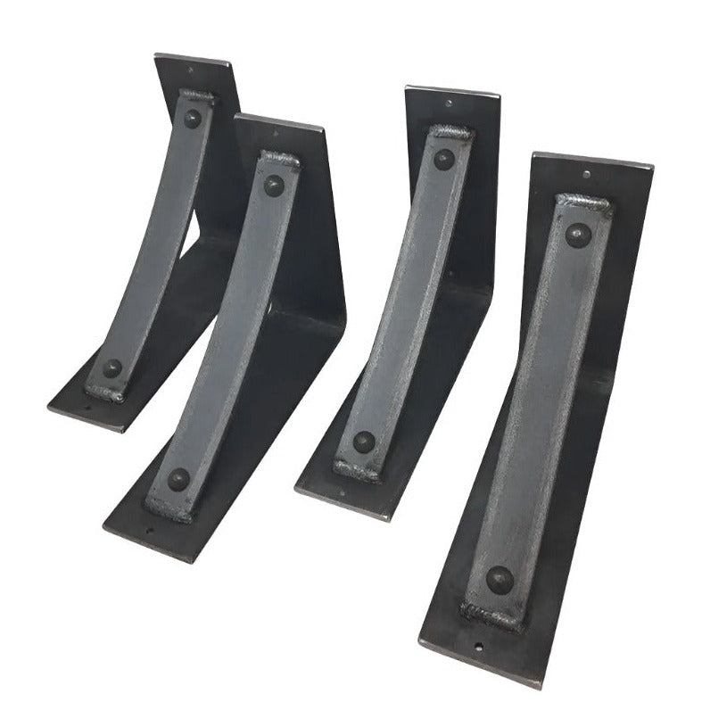 The Industrial Farm Co Troy Supports are a traditional "L" shaped bracket updated with a slightly curved support bar and decorative rivets. This design is 3 inches wide with a 1.5 inch curved support featuring rivets welded in at each end.