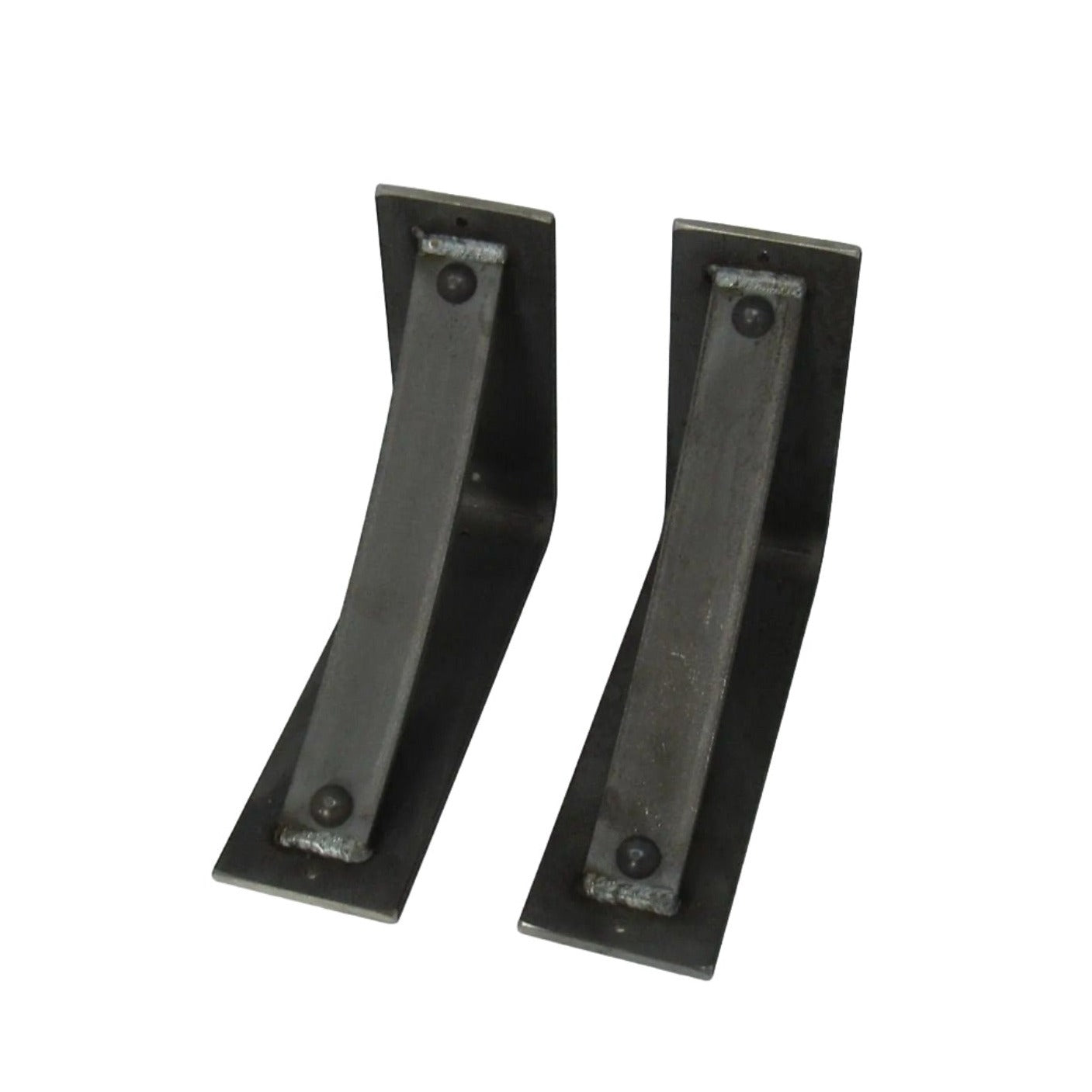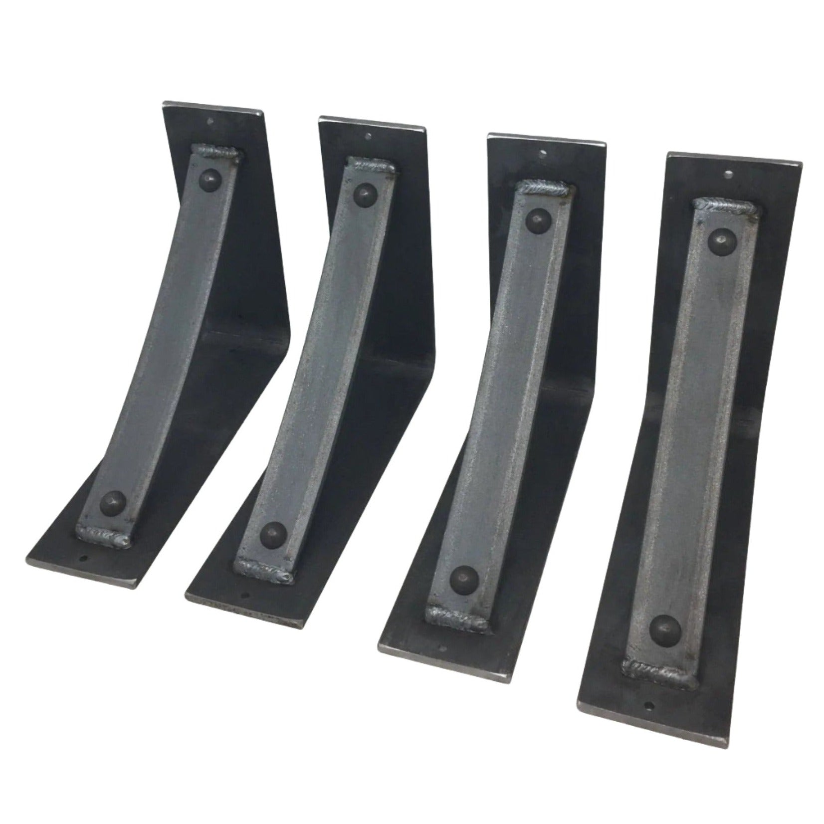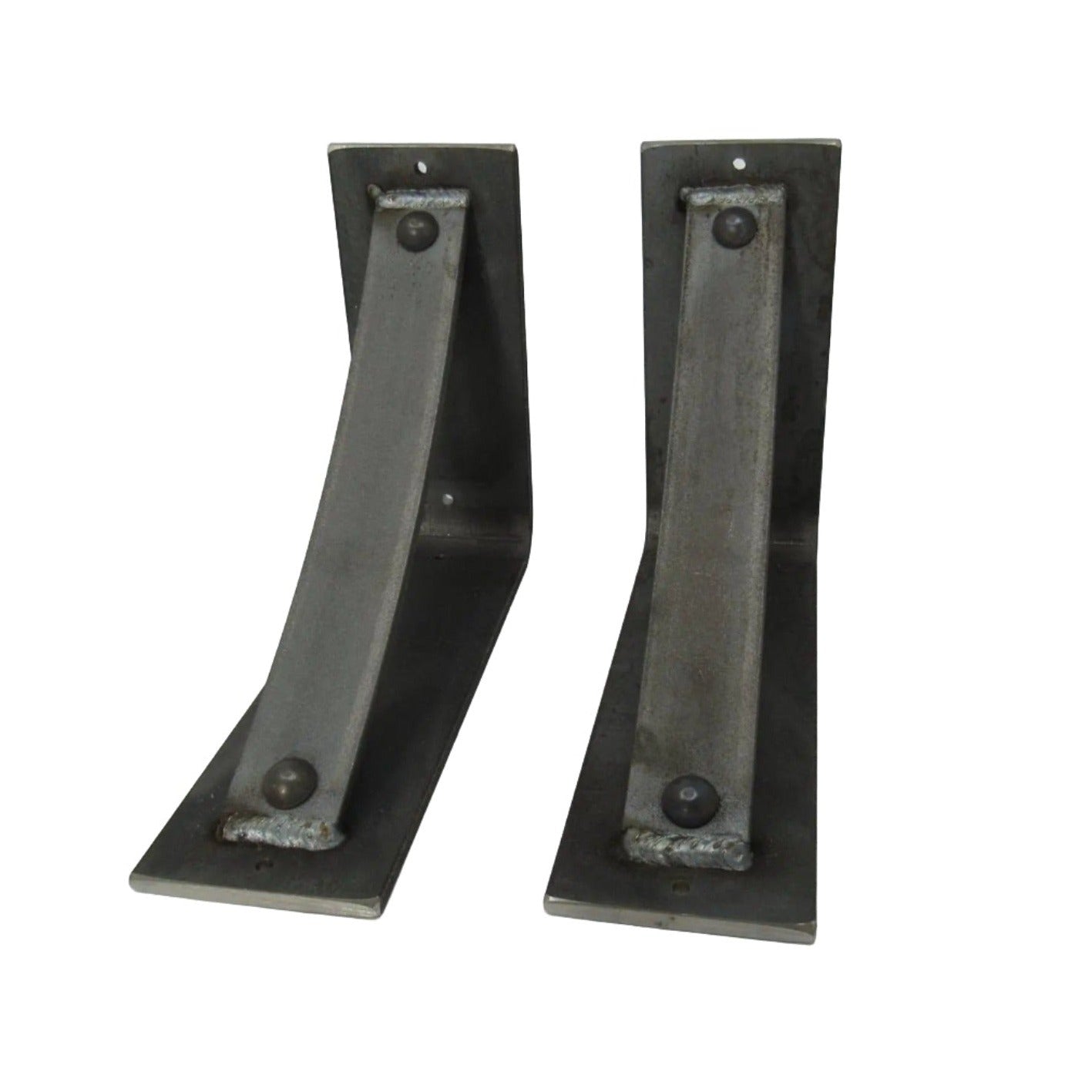 The Industrial Farm Co Troy Supports are a traditional "L" shaped bracket updated with a slightly curved support bar and decorative rivets. This design is 3 inches wide with a 1.5 inch curved support featuring rivets welded in at each end.